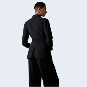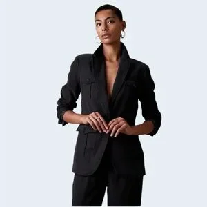 Sophisticated black suit jacket with buttoned front pockets. Sleek and versatile design. Ideal for professional settings.