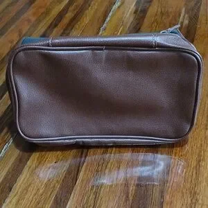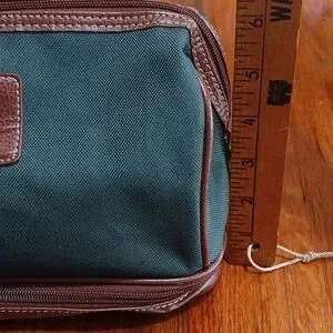 Polo Ralph Lauren Fragrance travel bag. Hunter green with brown faux leather accents and bottom zipper compartment.