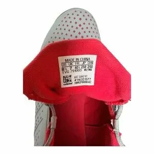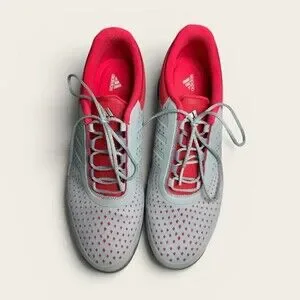 Classic Adidas Adipower Sport Boost golf shoes in a sleek gray and coral/hot pink colorway—lightweight, perforated upper with great traction outsole — a performance staple on and off the course. Clean interior, soles show normal wear.