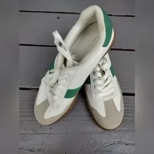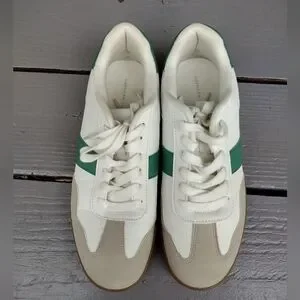Sleek white sneakers with bold green stripes. Comfortable and stylish for everyday wear.