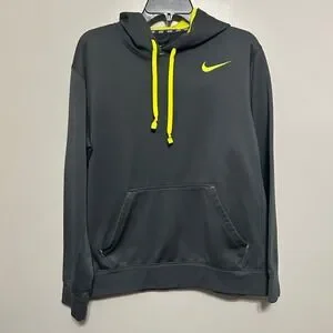 Stay warm and visible in this Nike Therma-FIT hoodie, designed with a sleek dark charcoal grey body and striking volt yellow accents. The interior features a soft fleece lining for superior heat retention, while the mesh-lined hood adds a touch of athletic breathability. A classic kangaroo pocket and adjustable drawstring hood make this a functional staple for your active wardrobe. This item is in good pre-owned condition with some light cracking on the interior logo print. Perfect for early morning runs, outdoor training sessions, or casual weekend errands.