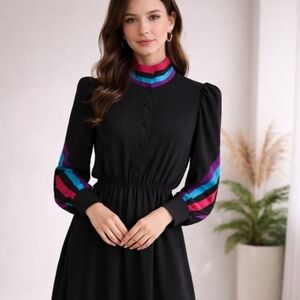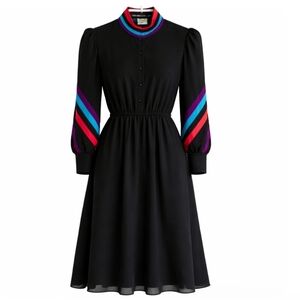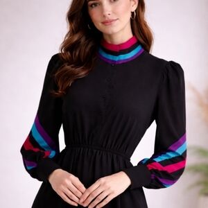 The look is elevated by bold red and turquoise accents at the high neckline and along the sleeves, adding a vibrant, retro-inspired contrast against the deep black base. Subtle structure comes from the elasticized waist, creating a flattering, cinched shape, while the 7-button cuff details add a refined, tailored touch to the voluminous sleeves.