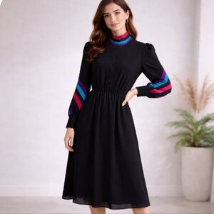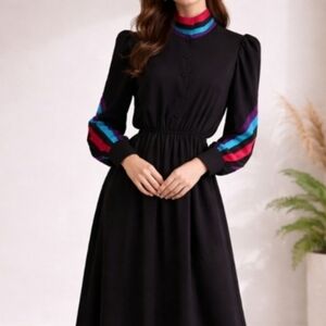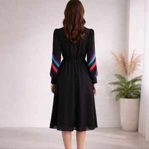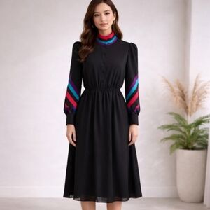 Benee | Vintage Black Semi-Sheer Midi Dress | Red & Turquoise Accent Collar