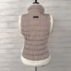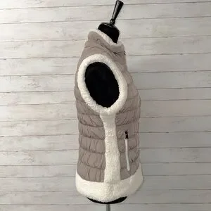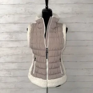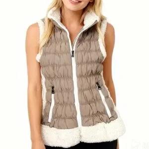 Calvin Klein Performance size medium puffer vest in a dark taupe. Ivory faux Sherpa/fleece trim along inner collar, armholes, & along hem. Collared. Zip front close. Dual zip hand pockets + inner zip security pocket. Lined. Cozy & cute!