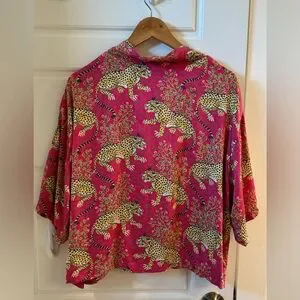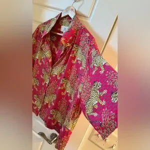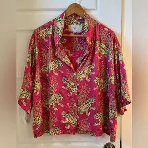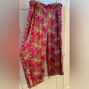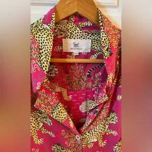 Take a walk on the wild side with our bestselling Bagheera satin PJ set in bold Hot Pink. This pajama set pairs a slightly cropped top with chic wide-leg pants. Crafted from silky-soft Eco Satin, Bagheera features our hand-painted jungle cats amid decorative flora, inspired by antique textiles. These pink pajamas have deep pockets, creating a fierce lounge set with bold style. Discover more in our satin loungewear.
