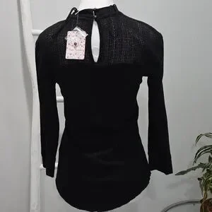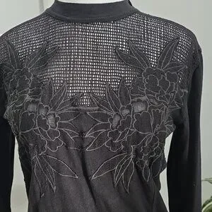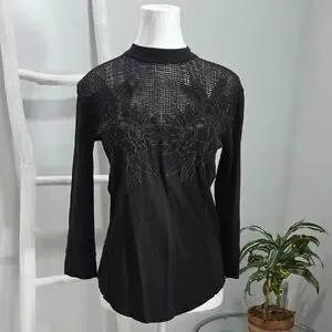 Elegant black long sleeve top with a delicate lace yoke and floral embroidery. Soft, lightweight fabric offers comfortable wear. Versatile style for dressy or casual looks. Black color adds classic sophistication.