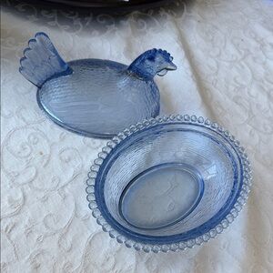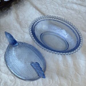 Indiana Glass Blue Hen on Nest Covered Dish with lid
