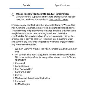 Disney's Winnie The Pooh Juniors' Graphic Skimmer Long Sleeve Tee Medium NWT