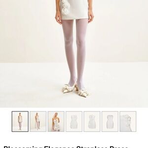 Chic strapless mini dress. Features elegant floral details. Perfect for special occasions.