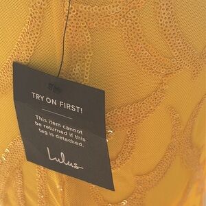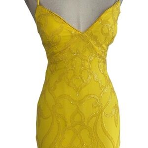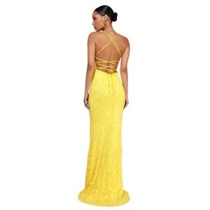 Elegant yellow lace gown with a fitted silhouette. Spaghetti straps and a V-neck front. Crisscross lace-up back adds drama. Floor-length hem for formal wear. Feminine and eye-catching.