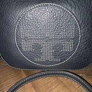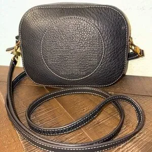 Beautiful Tory Burch Perry Bombé mini camera crossbody in classic black pebbled leather featuring the iconic perforated Double-T logo.