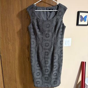 Elegant gray lace midi dress. Perfect for special occasions. Features intricate lace detailing. The Adrianna Papell Gray Crochet Sheath Dress is a stylish and elegant option for formal occasions such as weddings, parties, or cocktail events. This knee-length dress features a sleeveless design with a scoop neckline and intricate circle pattern crochet detailing. The dress is made of a polyester and spandex blend, ensuring a comfortable fit and flattering silhouette. The zipper closure adds a touch of sophistication, while the dress is lined for added quality and durability. This classic and timeless piece is perfect for the summer, fall, or spring seasons.