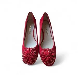 Make a grand entrance with these exquisite Anne Klein cocktail shoes. This pair features a rich, bright red suede body beautifully framed by metallic gold piped edges. The elegant design is topped off with a matching gold pom-pom accent on the toe, creating a sophisticated and festive look.