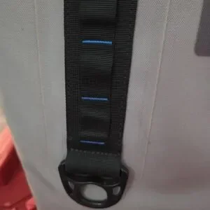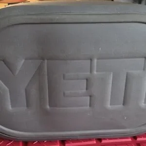 Sturdy Yeti cooler for travel and daily use. Grey canvas body with reinforced black webbing straps. Subtle blue stitch accents on the straps. Keeps drinks super cold for a long time ! Durable base for added protection.