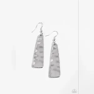 A triangular silver frame is hammered in rustic definition, resulting in an artisan inspired lure. Earring attaches to a standard fishhook fitting.