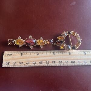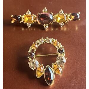 Lia Wreath Bar Brooch Pin G old Tone Lot Red Yellow Rhinestone Matching Gift Set