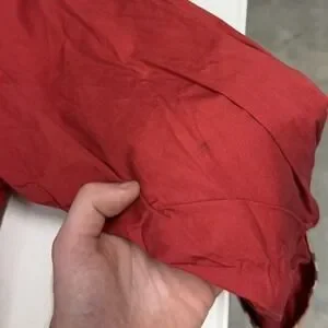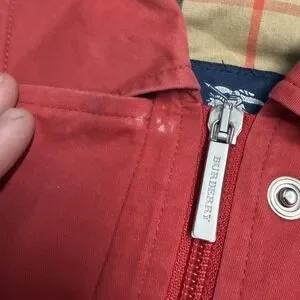 Burberry London hooded barn jacket in a vibrant red hue features the iconic Nova Check lining throughout the interior and under the cuffs. This versatile piece includes a detachable hood, full zip front with a snap-button storm flap, and adjustable drawstring waist for a tailored fit. Large front patch pockets provide ample storage, while the silver-tone hardware is engraved with the brand name for a signature finish. Note some minor cosmetic marks on the collar and sleeve as shown in photos.