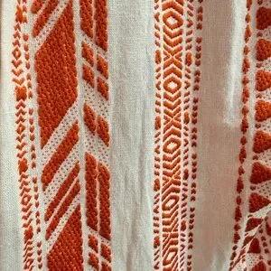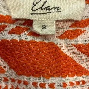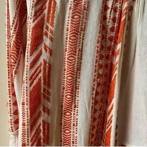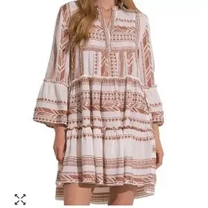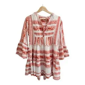 Gorgeous Elan embroidered tiered mini dress in a vibrant orange and white geometric/tribal-inspired pattern.