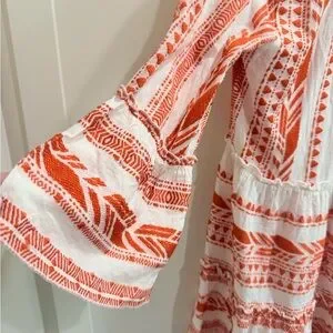 Elan Clara Orange White Embroidered Boho Mini Dress Bell Sleeve Pockets S