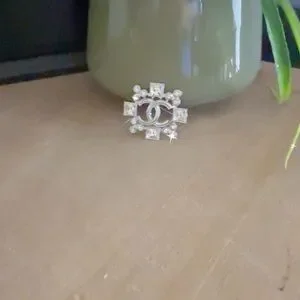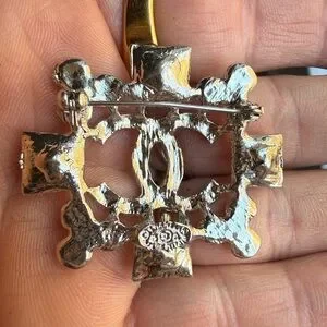 Stunning silver tone brooch featuring a bold geometric design with sparkling clear rhinestones and a double-letter center detail. This piece has a luxe, designer-style look with beautiful dimension and shine.
