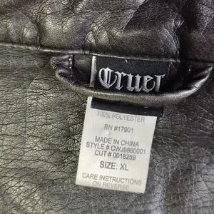 Cruel faux leather biker jacket in a metallic charcoal black finish offers a bold edge with its leopard print satin lining. Designed with a sleek mandarin collar and a full-length front zipper, it features quilted shoulder detailing and vertical princess seams for a tailored fit. Two zippered hand pockets provide functional storage, while the pebbled texture of the polyurethane shell gives it a realistic leather look. This versatile piece transitions easily from casual daytime wear to an evening out.
