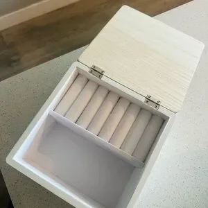 Rae Dunn “JEWELS” wood jewelry box in a neutral minimalist design. Perfect for storing jewelry, small accessories, or keepsakes and looks great on a dresser or vanity.