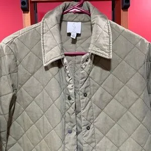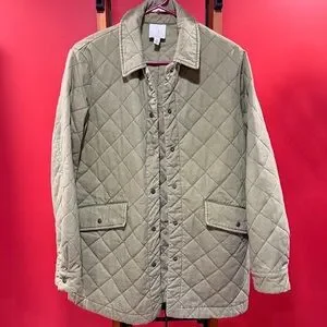 Women's Joie Quilted Barn Jacket in a size medium. Solid olive green color with a snap button front closure and all over quilted details. Oversized Fit (See Model Image for fit) Color may look different due to lighting but jacket is olive green.