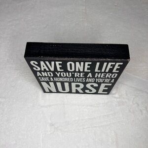 This piece of primitive style decor features a bold black background with white text, perfect for inspiring an office or home of a nurse. The minimalist design highlights the message 'SAVE ONE LIFE AND YOU'RE A HERO SAVE A HUNDRED AND YOU’RE A NURSE. Nurse in larger letters, creating a powerful statement piece. Perfect gift for a nurse.
