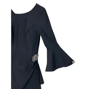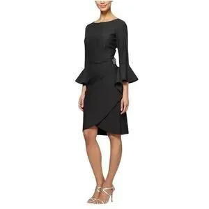 Elegant and structured, this Alex Evenings sheath dress features beautiful bell sleeves, a flattering draped wrap-style skirt, and a slimming compression fit that enhances the silhouette. The crystal embellishment at the waist adds a touch of sparkle without being over the top. Perfect for cocktail events, holiday parties, weddings, and evening occasions.