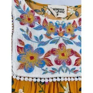 Savanna Jane Cottagecore Yellow Floral Embroidered Boho Pom Pom Trim Blouse M