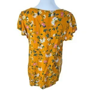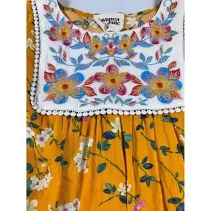 Savanna Jane mustard yellow floral blouse with a vibrant embroidered yoke. This short sleeve top features a relaxed fit with a white bib panel showcasing colorful floral embroidery and delicate pom-pom trim. The body is adorned with a dainty all-over floral print, perfect for a boho-inspired look. Crafted with a round neckline and a lightweight feel.