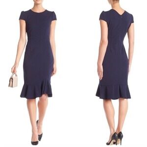Keywords: Cocktail, Wedding Guest, Professional, Career, Sophisticated, Feminine, Asymmetrical, Ruffle Hem, Crepe, Stretch, Classic, Navy Blue, Sheath, Midi Dress, Betsey Johnson
