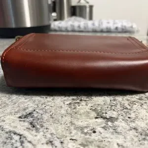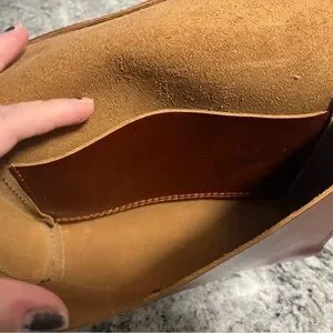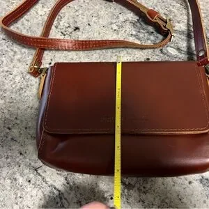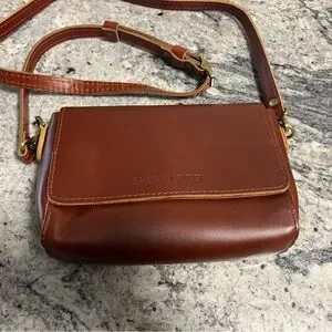 Used once , has a couple small surface scratches.Elegant tan leather crossbody with adjustable strap. Ideal for daily wear.