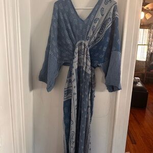 Anthropologie Blue Gauze Maxi Dress Boho Coastal Festival Flowy Asymmetrical One Size