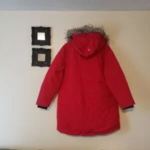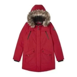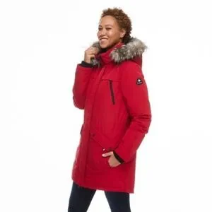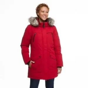 Beat cold weather conditions with Canadiana women's parka. Composed of water-repellent material, it's styled with a full-zip closure, two zippered pockets, two flap pockets, and a hood with faux fur at the opening.