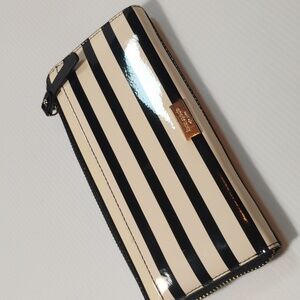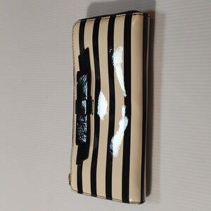 Kate Spade zip-around wallet. Patent finish with horizontal cream and black stripes. Decorative black bow accent. Gold-tone zipper hardware. Elegant, modern look.