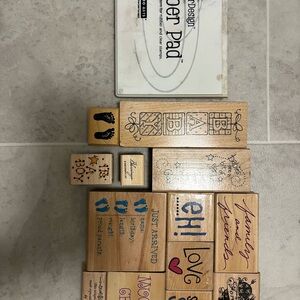 Natural wood sentiment stamp set featuring baby and family designs. Includes phrases like "family and friends", "Just Arrived", "Muchas Gracias", and decorative icons. Ideal for scrapbooking, card making, and gift projects. Natural wood color adds a warm, classic look.