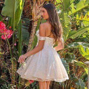 This short white babydoll wedding dress captures a dreamy, romantic charm with its off-shoulder sweetheart neckline and delicate layered skirt. Adorned with sparkling sequins and graceful butterfly appliqués, it’s the perfect blend of playfulness and elegance. Ideal for a modern bride who wants to shine with lightness, beauty, and effortless grace.