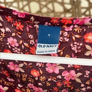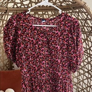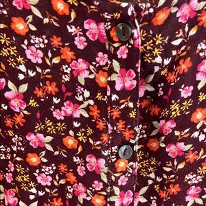 Lightweight floral long dress with puff sleeves. Burgundy base with pink and coral floral print. Button-front detail and a flattering waistline. Easy, feminine style for daytime or events.