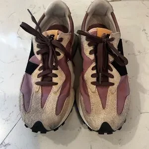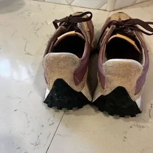 Classic New Balance silhouette with suede and fabric panels. Pink uppers with tan suede overlays. Black N logo for contrast. Cushioned midsole and lugged outsole. Versatile casual style.