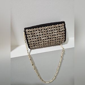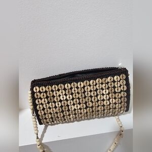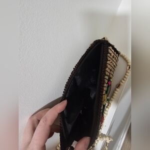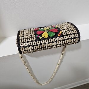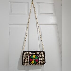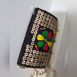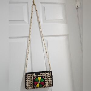 Handcrafted beaded crossbody bag with a vibrant multicolor flower accent. Natural bead exterior with green, yellow and pink flower petals for a playful look. Lightweight and easy to carry for everyday outings. Clean, eye-catching design that complements casual outfits.