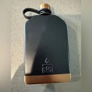 Sleek black flask with gold accent. Perfect for carrying your favorite beverage.