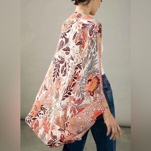 Beautiful Larissa floral kimono by Anthropologie, featuring a soft, flowy silhouette with an open front design and lightweight feel. Covered in a romantic spring floral print with shades of pink, coral, burgundy, and soft neutrals. Perfect for layering over loungewear, denim, tanks, or dresses.