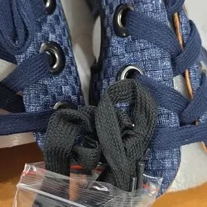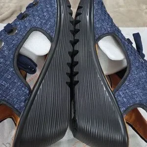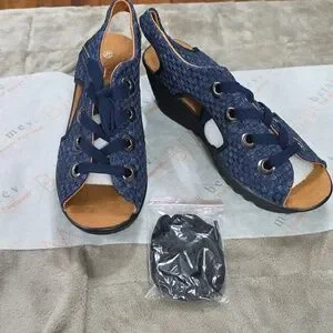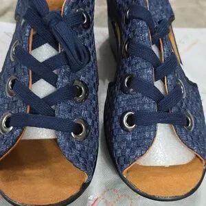 NEW Bernie Mev "Marcelo" Women's Wedge Sandals Lace Up Woven Denim 2 Laces 42/11. Measurements in pics. Navy and black laces.