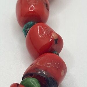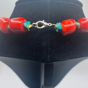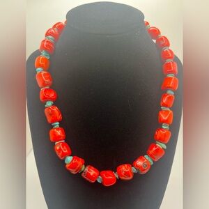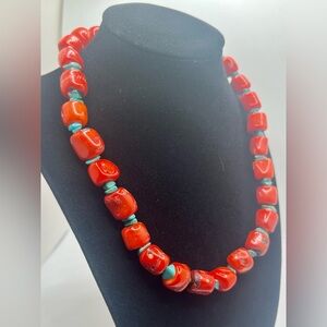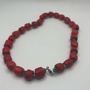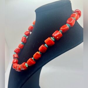 chunky red bamboo coral bead necklace with turquoise spacers southwestern style