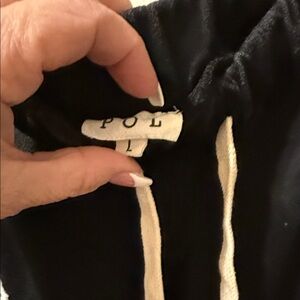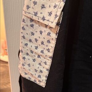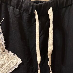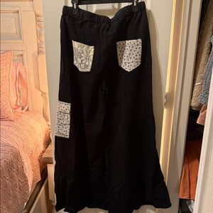 Comfortable black wide-leg lounge pants. Elastic waist with drawstring. Decorative distressed star patches and a patterned patch on one leg. Soft, relaxed fit for casual wear.