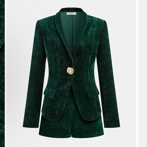 Elevate your look with this deep green velvet blazer and shorts. Features a tailored silhouette and a decorative metal button for a polished finish. Soft velvet fabric offers luxurious texture and comfortable wear.