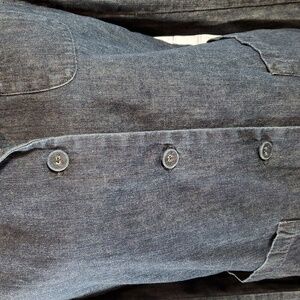 Chic DKNY denim blazer-like jacket in size 6. Dark blue hue. Stylish button-up design. Front pockets. 80% Cotton, 20% Polyester. Excellent pre-loved condition. No blemishes and not faded from washing, almost like new.