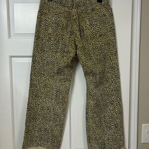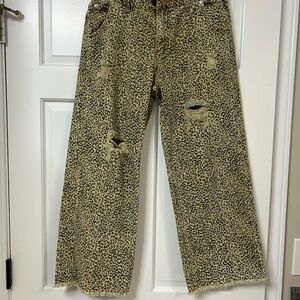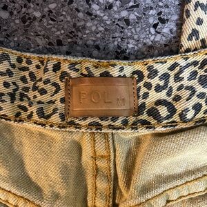 High-waist pants with leopard-print trim along the waistband. Leather POL brand patch sewn at back. Bold yellow denim with black spotted pattern. Stylish piece for casual outfits.