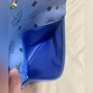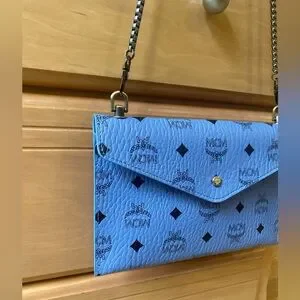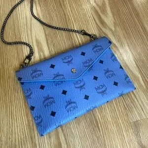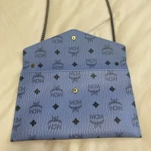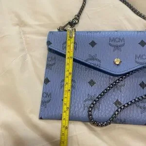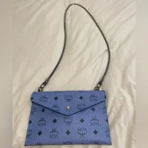 Authentic MCM beauty bag converted into a crossbody// shoulder bag. Powder Blue with a gun metal all over MCM logo print. Button closure. I added the rivets & gun metal black “bike chain” strap. You can remove the strap & add another 1 to fit your style needs. I wore once it’s in like new condition. No flaws. ⭐️ See my reviews in the About me section ⭐️